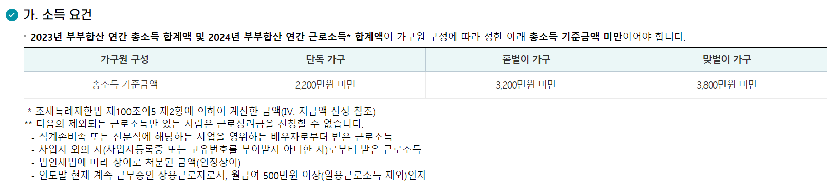 ■ 소득 요건: 2023년 소득 기준으로 단독 가구는 2,200만원, 홑벌이 가구는 3,200만원, 맞벌이 가구는 3,800만원 이하인 경우