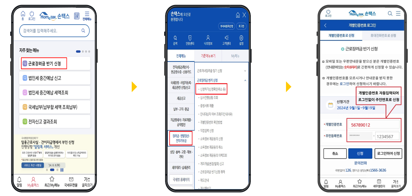 - 홈택스 접속 → 장려금·연말정산·전자기부금 → 근로장려금 반기 → 신청하기