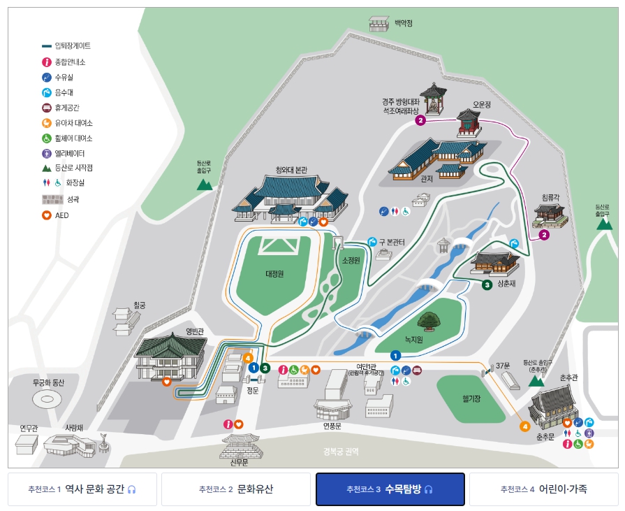 자연과 어우러진 산책로가 잘 마련되어 있으니, 청와대 관람을 마친 후 북악산 자락을 따라 산책을 즐겨보세요.
