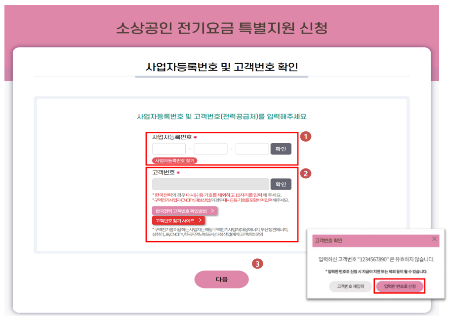 ③ 사업자 및 고객번호확인: 사업자번호 입력 후 [확인] → 전기요금 고지서에 표기된 고객번호 입력 후 [확인]