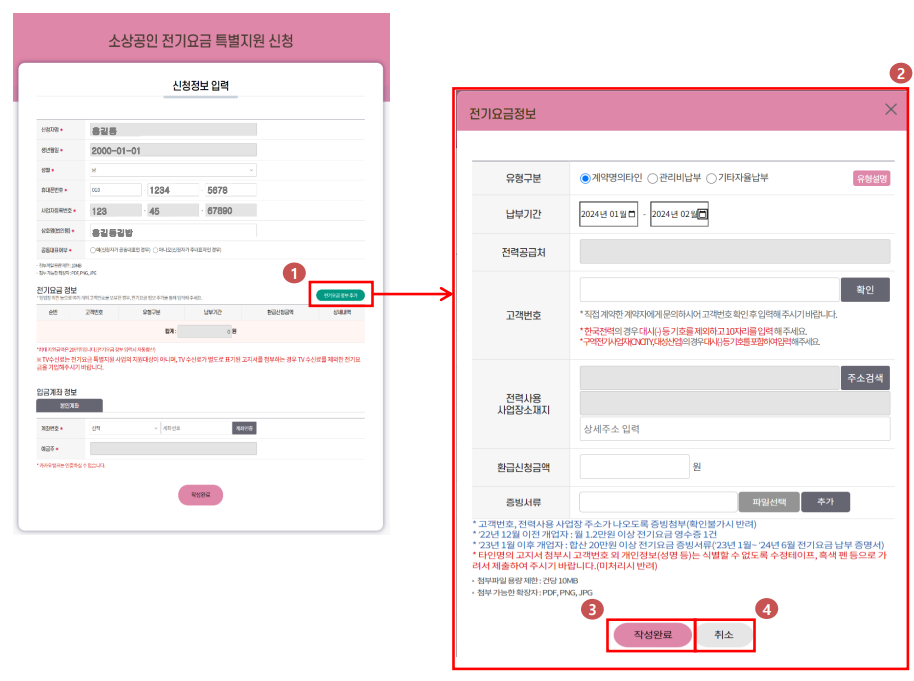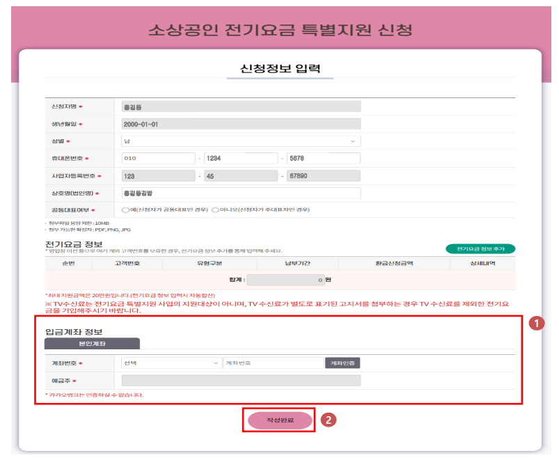 ⑥ 비계약사용자 신청: 기본 신청정보 입력 → [전기요금 정보 추가] 버튼을 눌러 전기요금 정보 입력 → 입금계좌 정보 입력[인증하기] 버튼 눌러 확인 후 [완료] 버튼을 클릭
