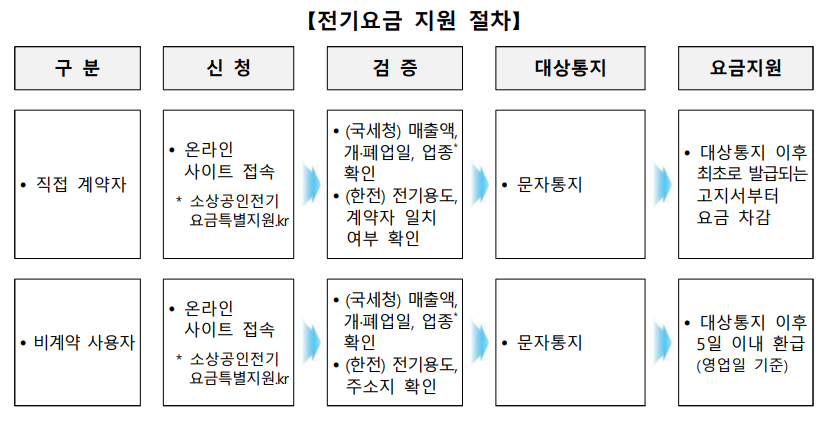 소상공인 전기요금 특별지원 신청 시 직접계약자와 비계약사용자의 신청 방법이 상이하니 확인 후 신청바랍니다.
