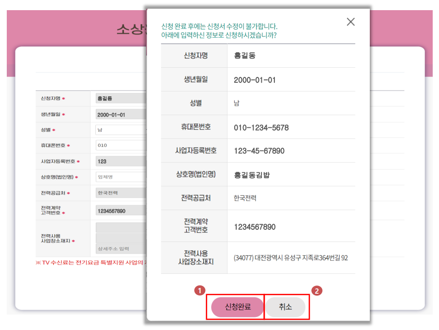 ⑦ 신청완료: 입력한 신청 정보를 확인 후 [신청완료] 버튼 클릭
