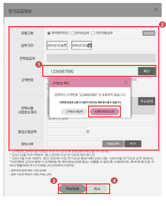 (추후 고객번호 확인 절차 별도 진행됨. 단, 전기요금 지급이 지연 또는 제외될 수 있음)