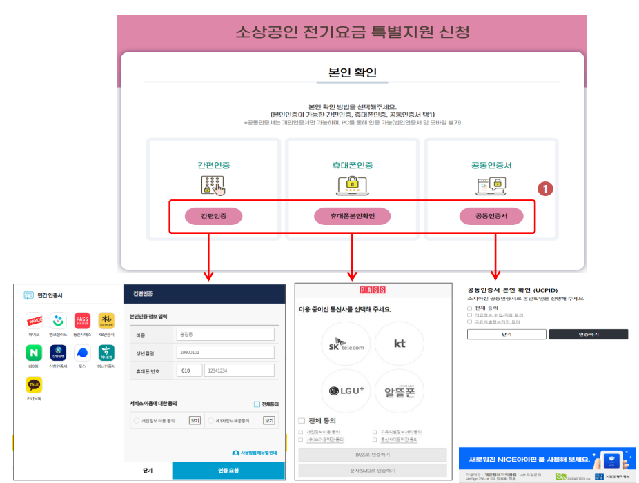 ⑤ 본인인증: 간편인증, 휴대폰인증, 공동인증서 중 하나를 선택하여 본인 확인 진행한 뒤 신청단계로 이동