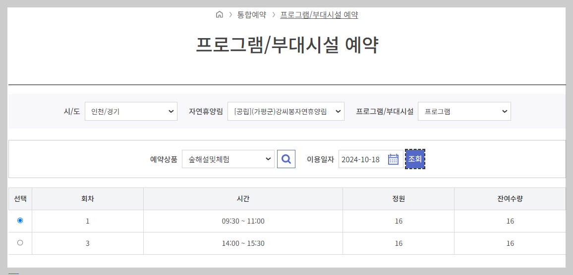 국립자연휴양림 홈페이지 숲나들e에서는 숙박시설 뿐만 아니라, 프로그램/부대시설 이용도 예약 가능합니다.