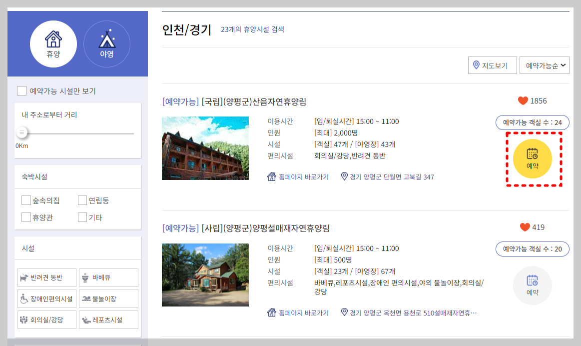 ③ 원하는 자연휴양림의 예약가능 여부를 확인 후 [예약]버튼을 눌러 예약 화면으로 이동합니다.