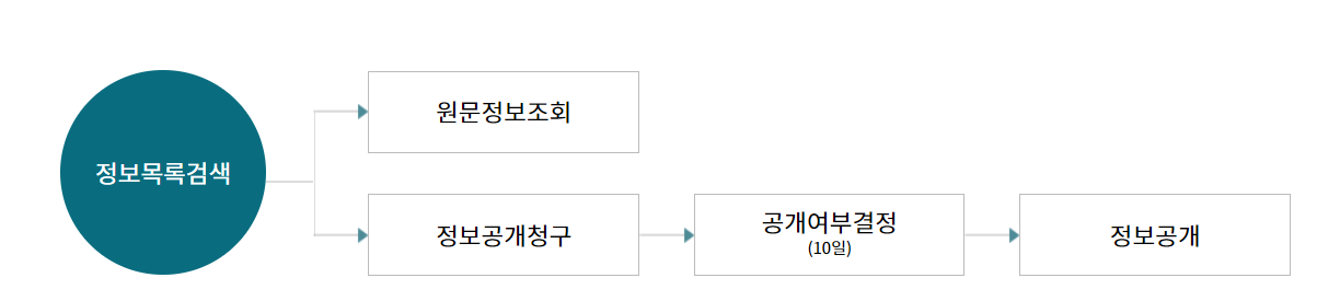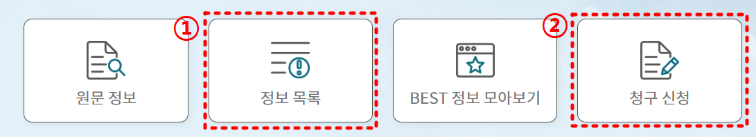 ① 정보 목록에 없을 경우, 정보 공개 ②청구 신청 통해 정보를 열람할 수 있습니다.