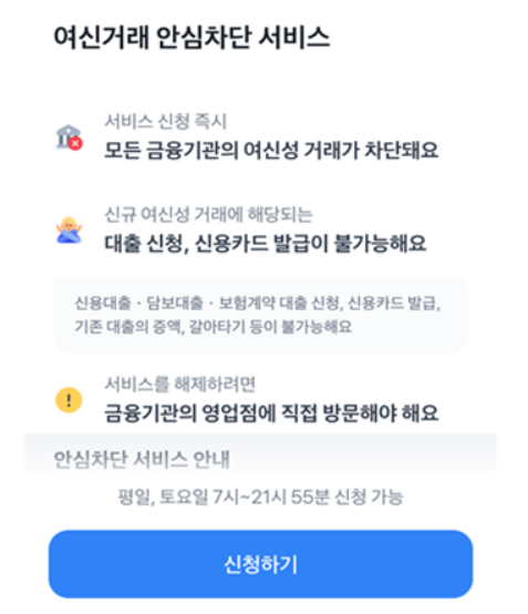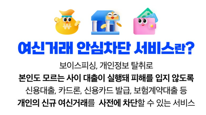 여신거래안심차단서비스는 급증하는 금융 사기 예방을 위한 서비스입니다. 해당 서비스를 이용하여 보다 안전한 신용 거래하시기 바랍니다.