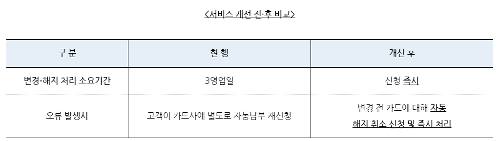 '카드자동납부 통합관리'에서 아파트 관리비, 공공임대료의 자동납부를 변경·해지하고 실시간 처리 결과를 확인할 수 있습니다.