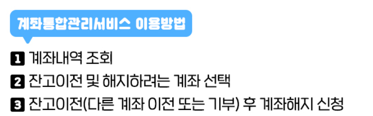 계좌정보 통합관리서비스는 공인인증서나 휴대폰 인증만으로 은행별로 방문하지 않고도 계좌 조회, 잔고 이체, 해지 등을 이용할 수 있습니다.
