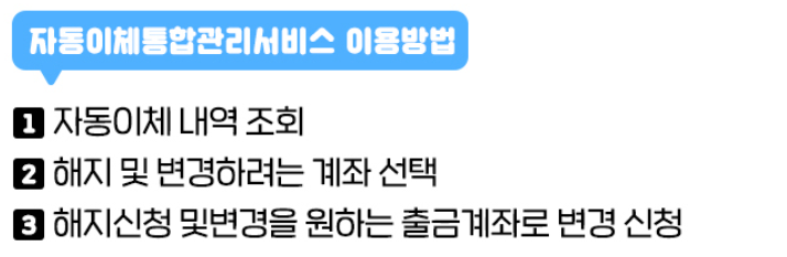 '내 자동이체 한눈에' 에서 여러 은행에 분산되어 있는 자동이체 정보를 확인, 변경, 해지할 수 있습니다.