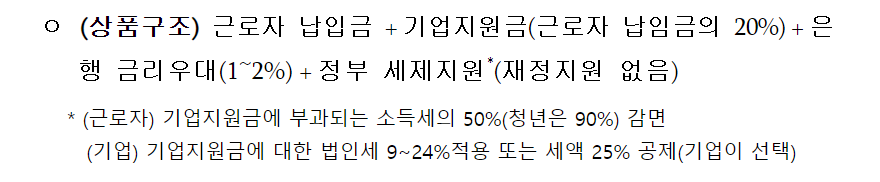 예) 협약 은행은 저축 상품 평균 금리가 3.5%일 때, 중소기업 재직자가 우대공제 가입 시 금리가 5%로 향상