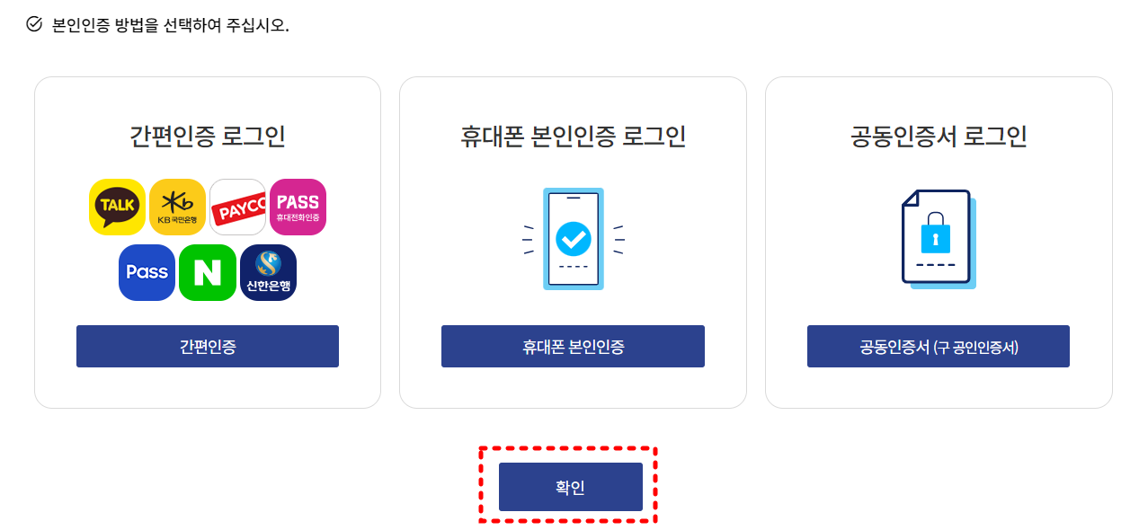 ⑤ 실명 인증 후 간편인증, 휴대폰 본인인증, 공동인증서 중 선택하여 본인 인증합니다.