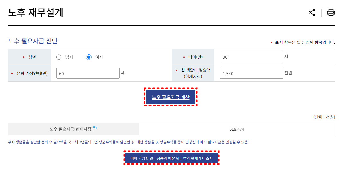 *나이(만)와 *은퇴 예상연령(만) 작성 후 조회 → *월 생활비 (현재시점) 확인 → 노후 필요자금 계산 버튼 클릭 → 이미 가입한 연금상품의 예상 연금액의 현재가치 조회(노후 필요자금 대비 부족 금액 확인 가능)