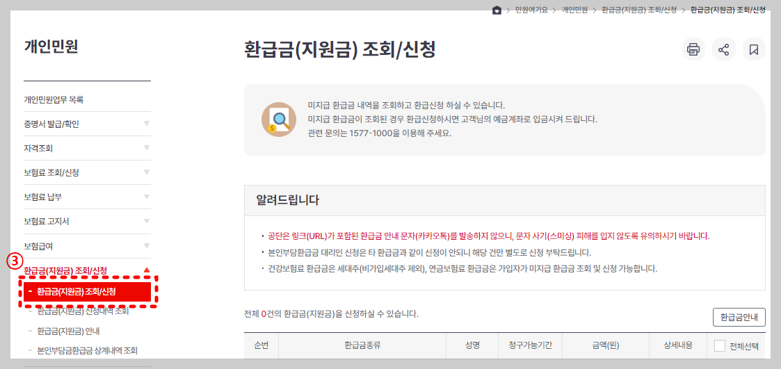 · 국민건강보험공단 홈페이지 로그인 → 민원여기요 → 개인민원 → 환급금(지원금)조회/신청 → 환급 계좌정보 입력 후 신청 완료