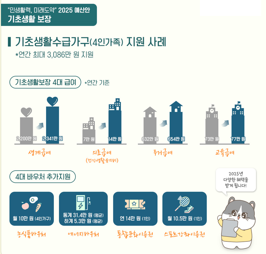 생활이 어려운 국민들에게 최소한의 생활을 유지할 수 있도록 지원하며, 주거, 의료, 교육, 생계 등 다양한 분야에서 혜택을 제공합니다.