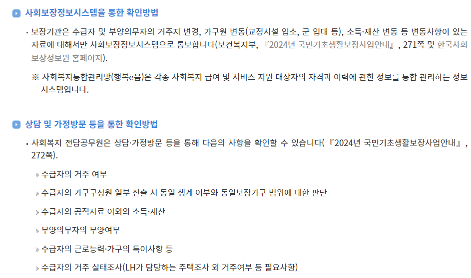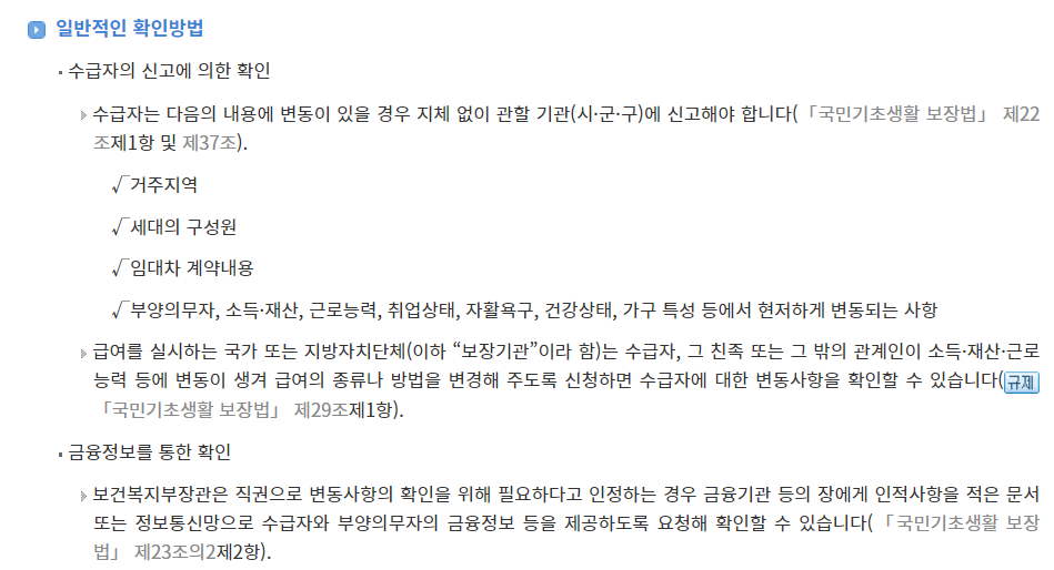 기초생활수급자로 선정된 이후에도 지속적인 자격 유지 여부를 점검합니다.