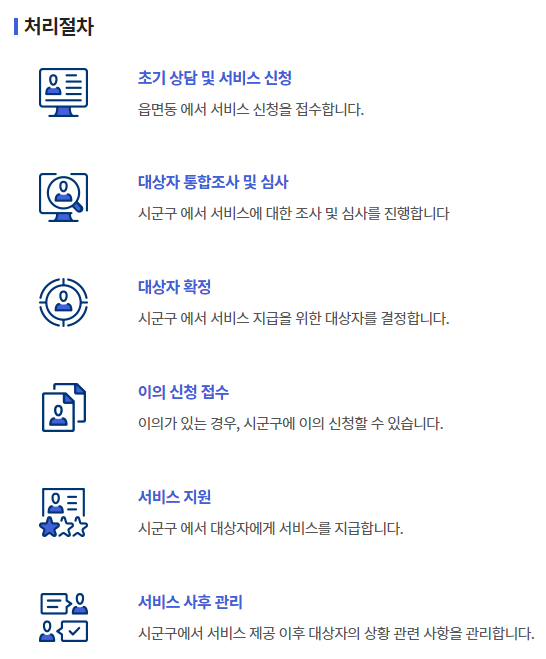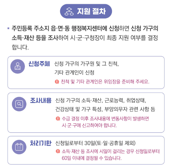 · 주민센터 방문 → 신청서 작성 및 제출 → 가구 조사 → 수급자 선정 → 혜택 제공 → 사후 관리