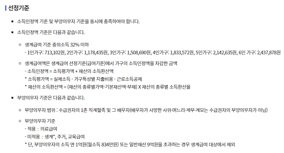 ■ 부양의무자: 부양의무자의 소득과 재산도 고려하여 지원 여부를 결정합니다. (단, 부양의무자 기준은 완화되었으며, 경우에 따라 적용되지 않을 수 있습니다.)