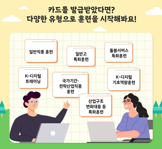예를 들어, 영상 편집, 웹 디자인, 프로그래밍, 간호·돌봄 서비스 등 다양한 과정이 있으니 자신에게 필요한 분야의 훈련을 받을 수 있습니다.