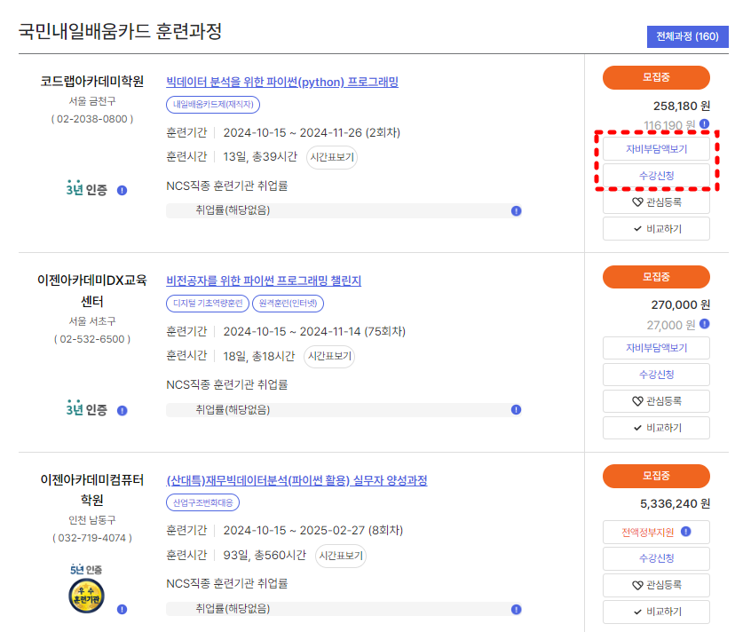 원하는 강의를 선택한 후 개강일자, 지역을 확인하고, 본인이 부담해야 하는 자비 부담액을 확인할 수 있습니다.