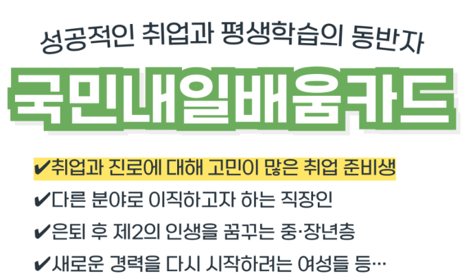 국민내일배움카드는 실업자와 재직자, 특수형태근로종사자, 자영업자(일정 소득 이하) 등 직업훈련을 희망하는 국민이라면 누구나 신청할 수 있습니다.