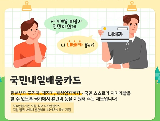 국민내일배움카드는 청년, 실업자, 재직자, 자영업자 등 국민들이 직업 훈련을 통해 자기개발을 할 수 있도록 국가에서 훈련비를 지원해주는 제도입니다.