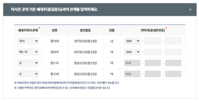 전입자 전원에 대한 연락처 정보를 입력하도록 변경되었습니다.