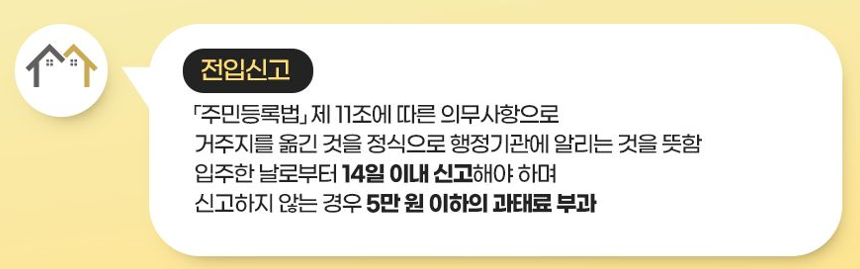 전입신고는 주민등록법에 따라 새로운 거주지로 이사한 후, 해당 사실을 행정기관에 알리는 필수적인 절차입니다. 이사를 했다면 입주일로부터 14일 이내에 전입신고를 해야 하며, 이를 어길 경우 최대 5만 원의 과태료가 부과될 수 있습니다.