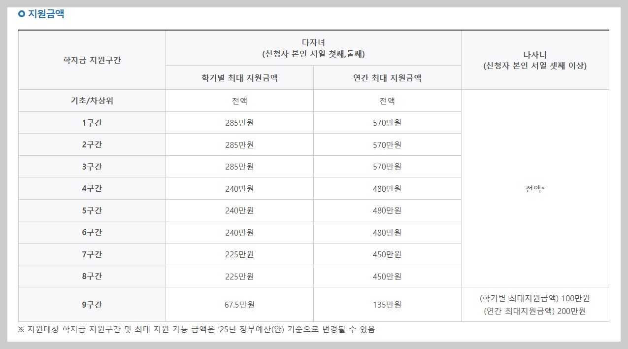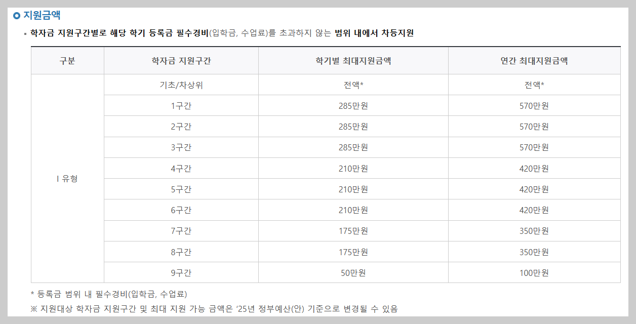 - 1~3구간: 최대 570만 원 (학기별 최대 285만 원)