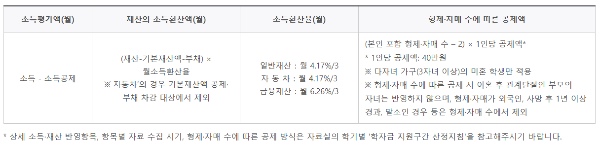 [소득인정액(월)] = ①소득 평가액(월) + ②재산의 소득 환산액(월) - ③형제·자매 수에 따른 공제액