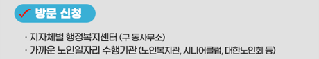 방문 신청은 인터넷 사용이 어려운 경우, 가까운 행정복지센터나 노인복지관, 시니어클럽 등을 직접 방문해 도움을 받으세요.