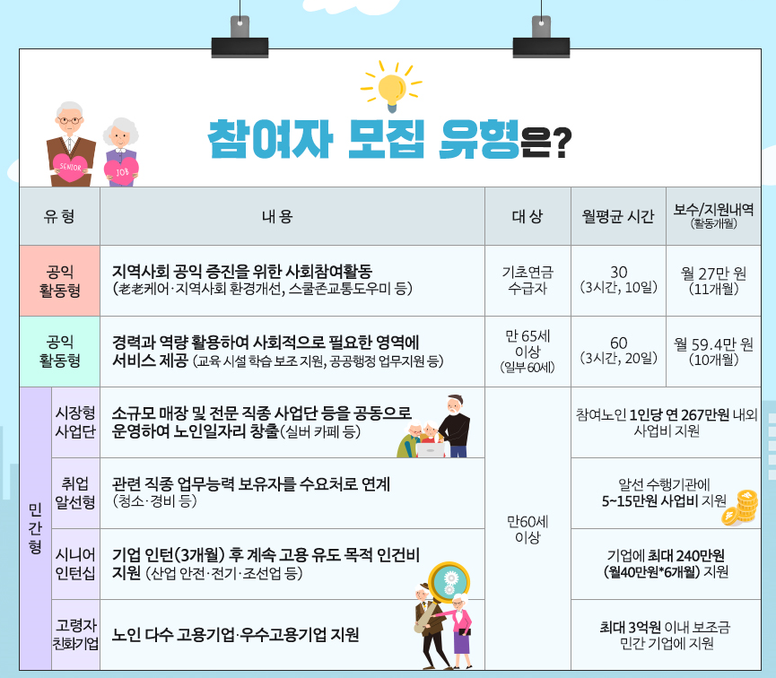 노인일자리 사업에 참여를 희망하는 어르신들께서는 아래 정보를 참고하시어 본인의 조건과 생활 패턴에 맞는 일자리를 선택하시길 바랍니다.