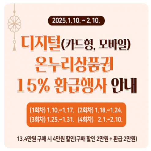 할인 혜택뿐만 아니라, 디지털 온누리상품권으로 결제하면 결제 금액의 최대 15%를 환급받을 수 있는 이벤트도 진행됩니다.