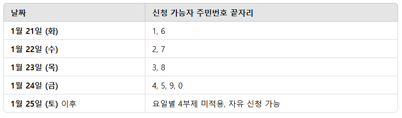 ※ 4부제 신청 요일 기준 (1월 21일 ~ 1월 24일) *요일별 4부제는 신청 첫 주만 적용됩니다.
